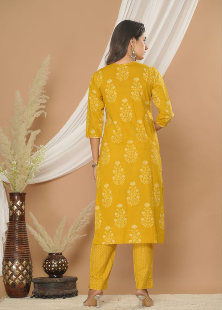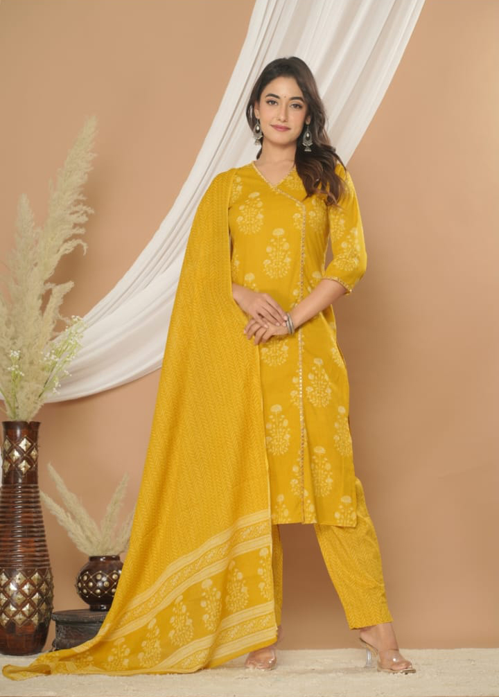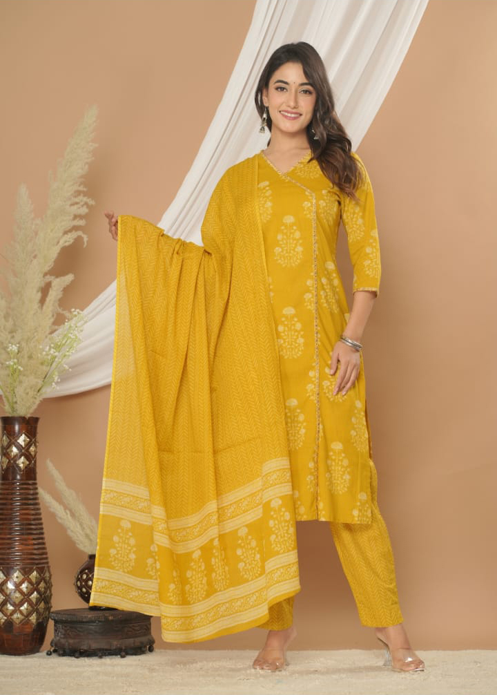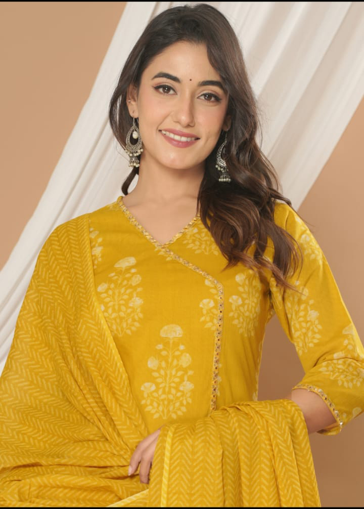 Brighten up your ethnic collection with this beautiful yellow cotton dupatta set. Made from premium 60-60 cotton fabric, this outfit offers a soft, breathable feel for all-day comfort. The subtle prints combined with elegant handwork embroidery enhance its traditional charm, making it perfect for daily wear, festive occasions, and casual outings.