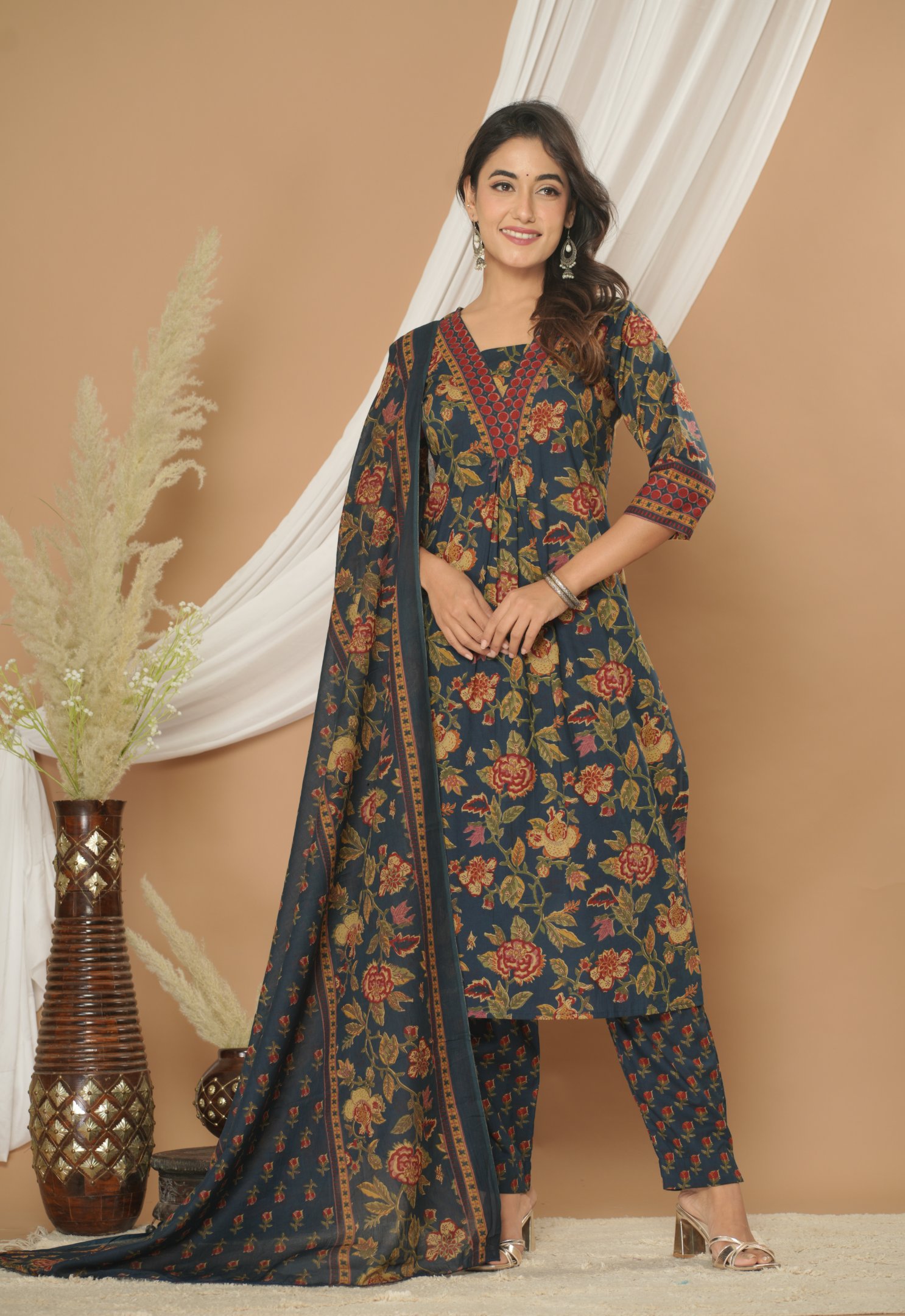 Buy elegant navy blue floral printed 60×60 cotton kurta pant set with dupatta. Soft, breathable fabric perfect for festive occasions, office wear and traditional functions.