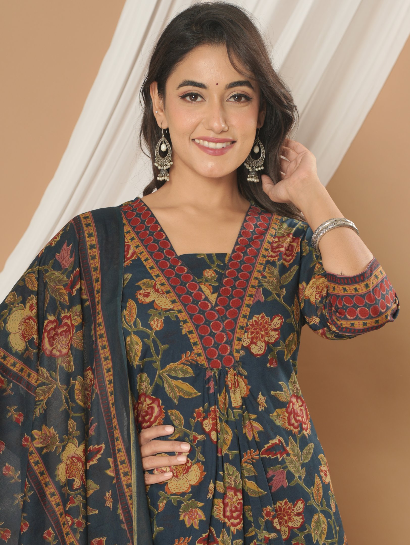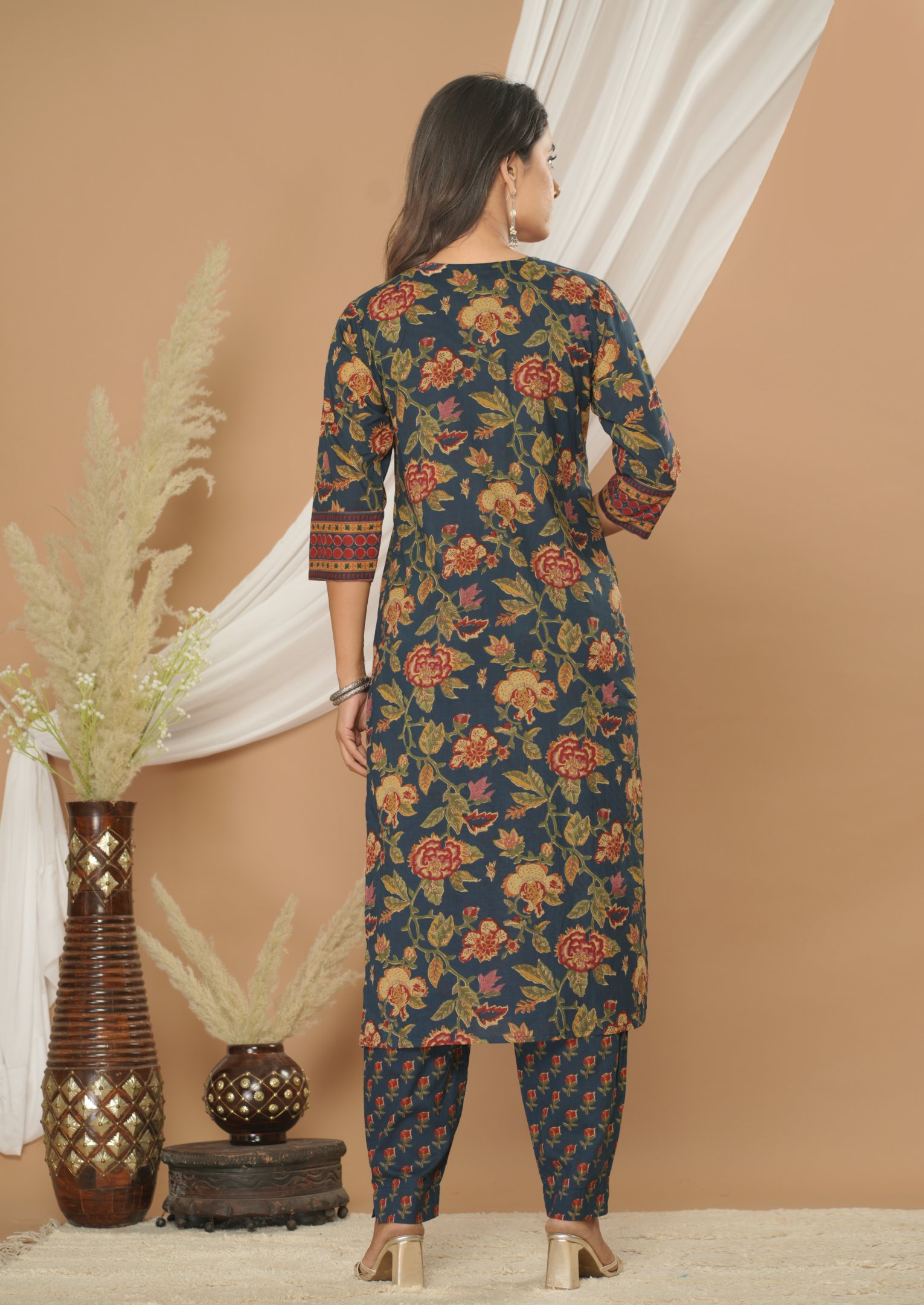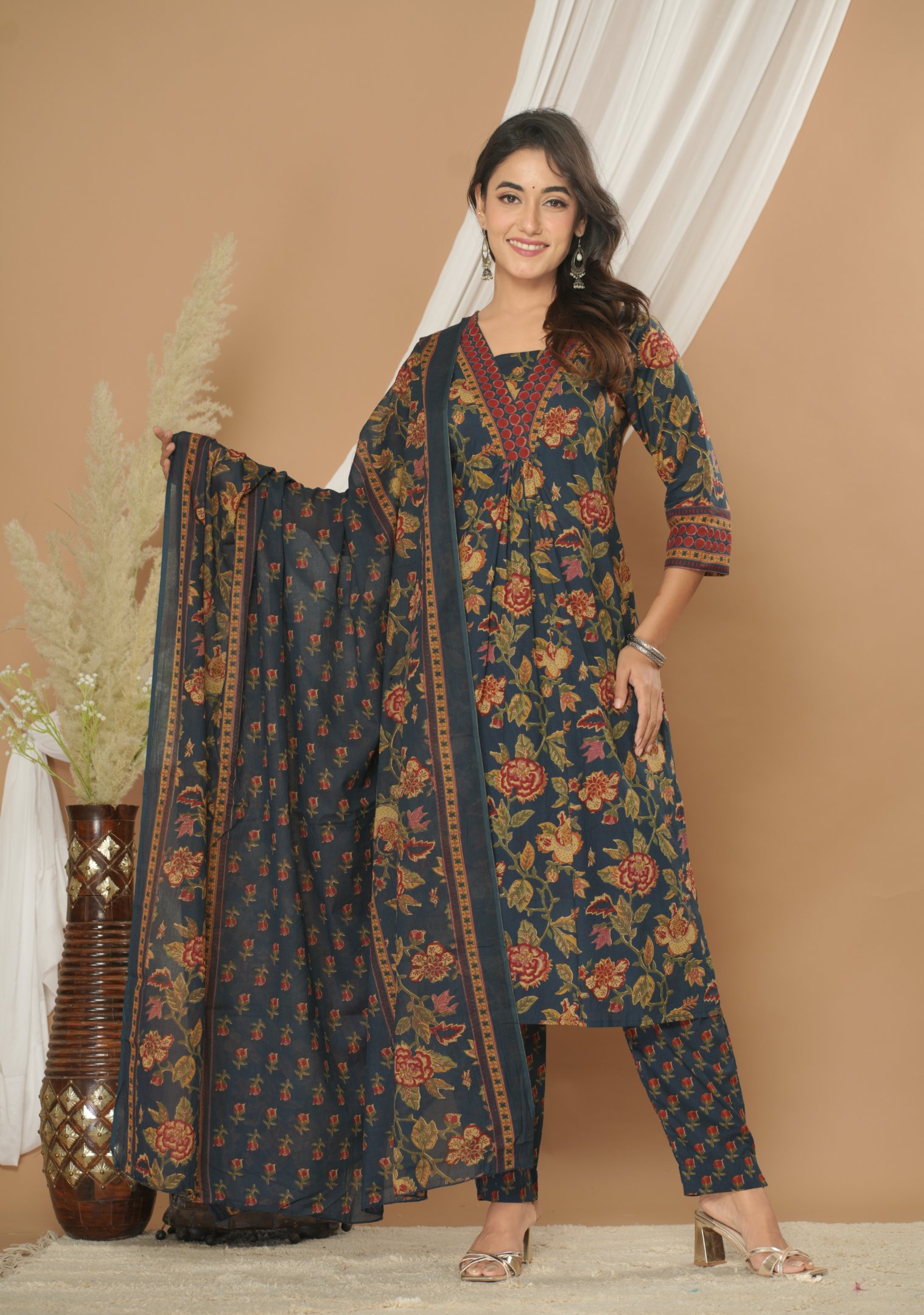 Make a graceful statement with this beautiful navy blue floral printed kurta pant set with dupatta. Crafted from premium 60×60 cotton fabric, this outfit offers superior comfort while maintaining a rich ethnic appeal.