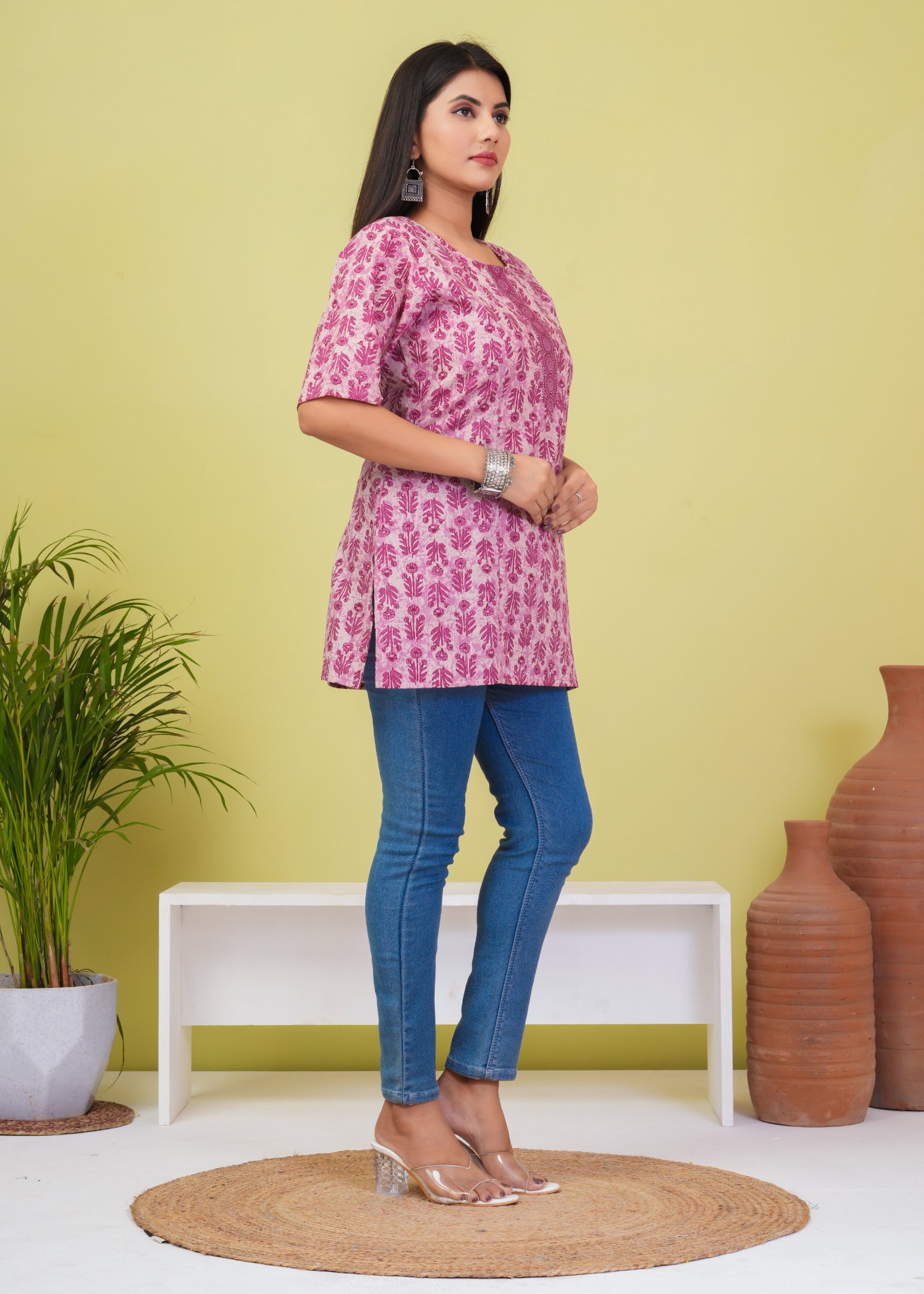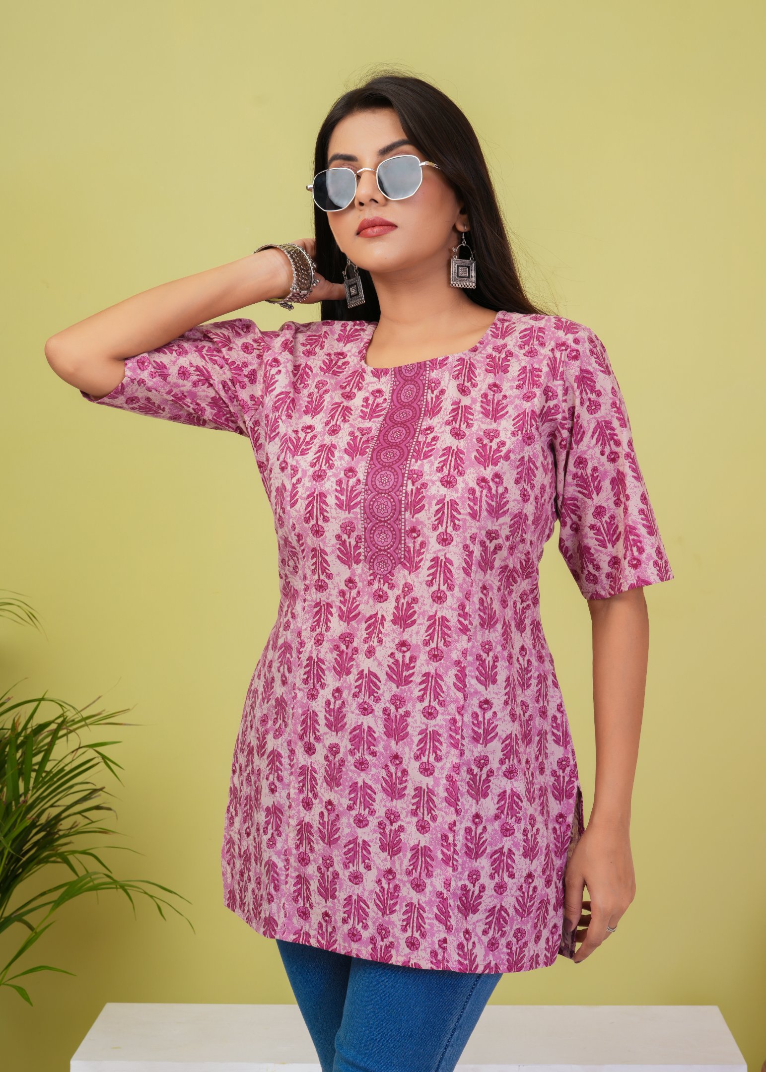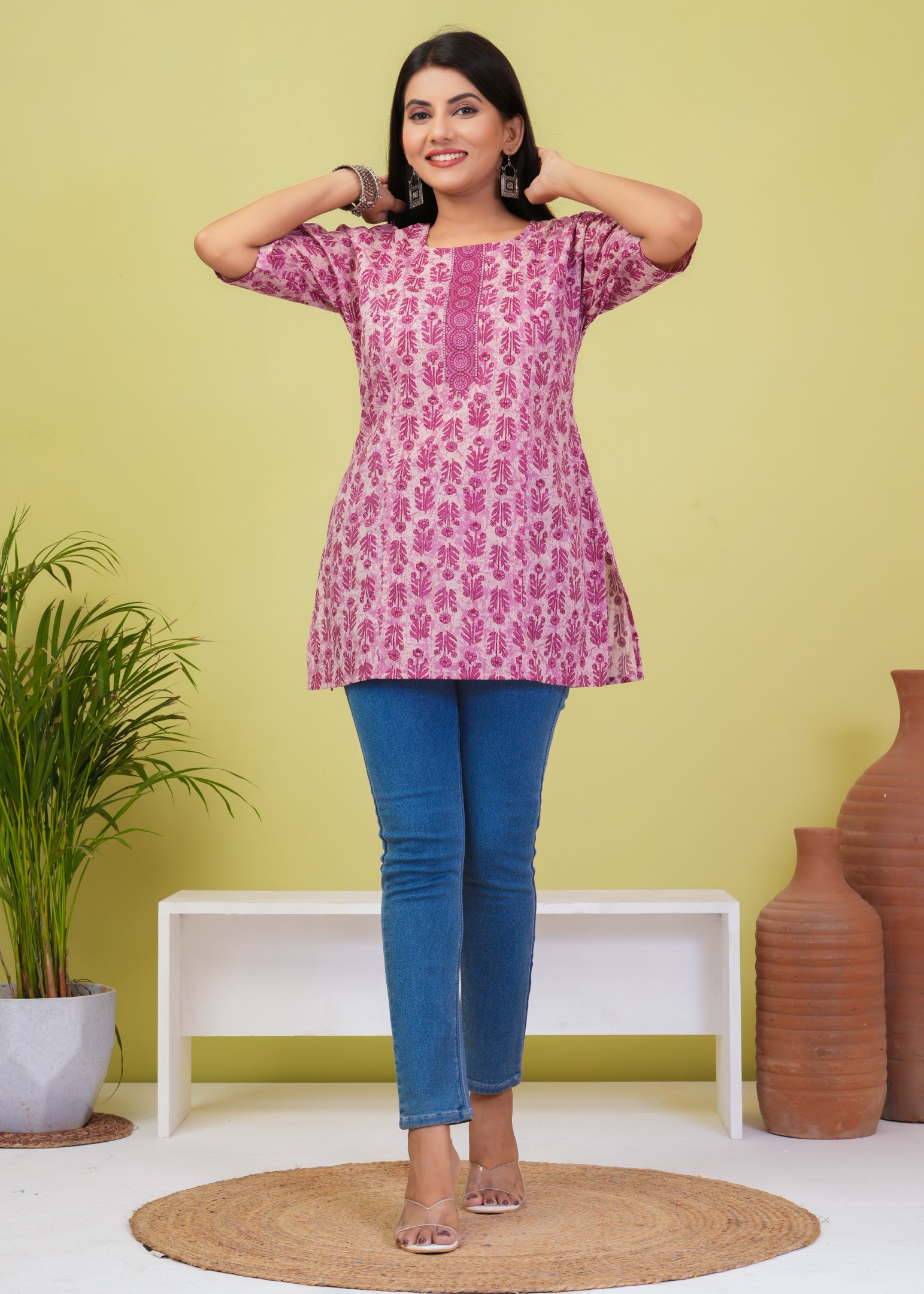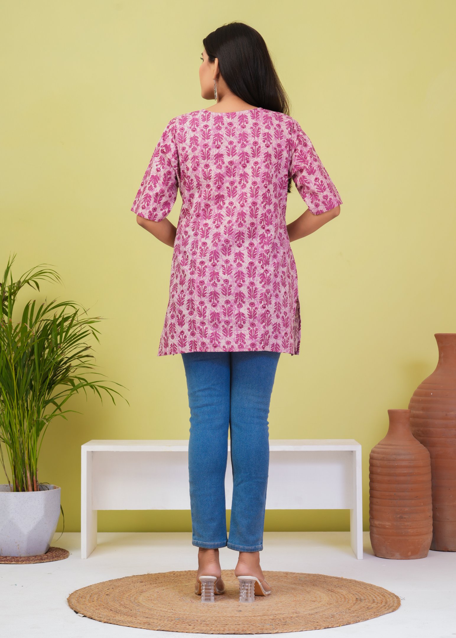 Refresh your everyday wardrobe with this elegant pink floral printed short kurti. Crafted from soft and breathable cotton fabric, this kurti offers all-day comfort with a trendy ethnic touch.